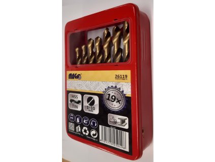 TRIUMF 100-01085 vrtáky spirálové broušené HSS, průměr 1,0 - 10,0 mm, sada 19 dílů Vrtáky spirálové broušené jsou vyrobeny z rychlořezné oceli HSS v souladu s normou DIN 340....